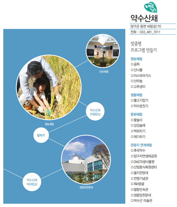 (사)양구군농촌체험관광협의회 | 주소 : 강원특별자치도 양구군 양구읍 황강길 28 | 대표전화 : 033)482-1427 | 전화 : 033)482-1427