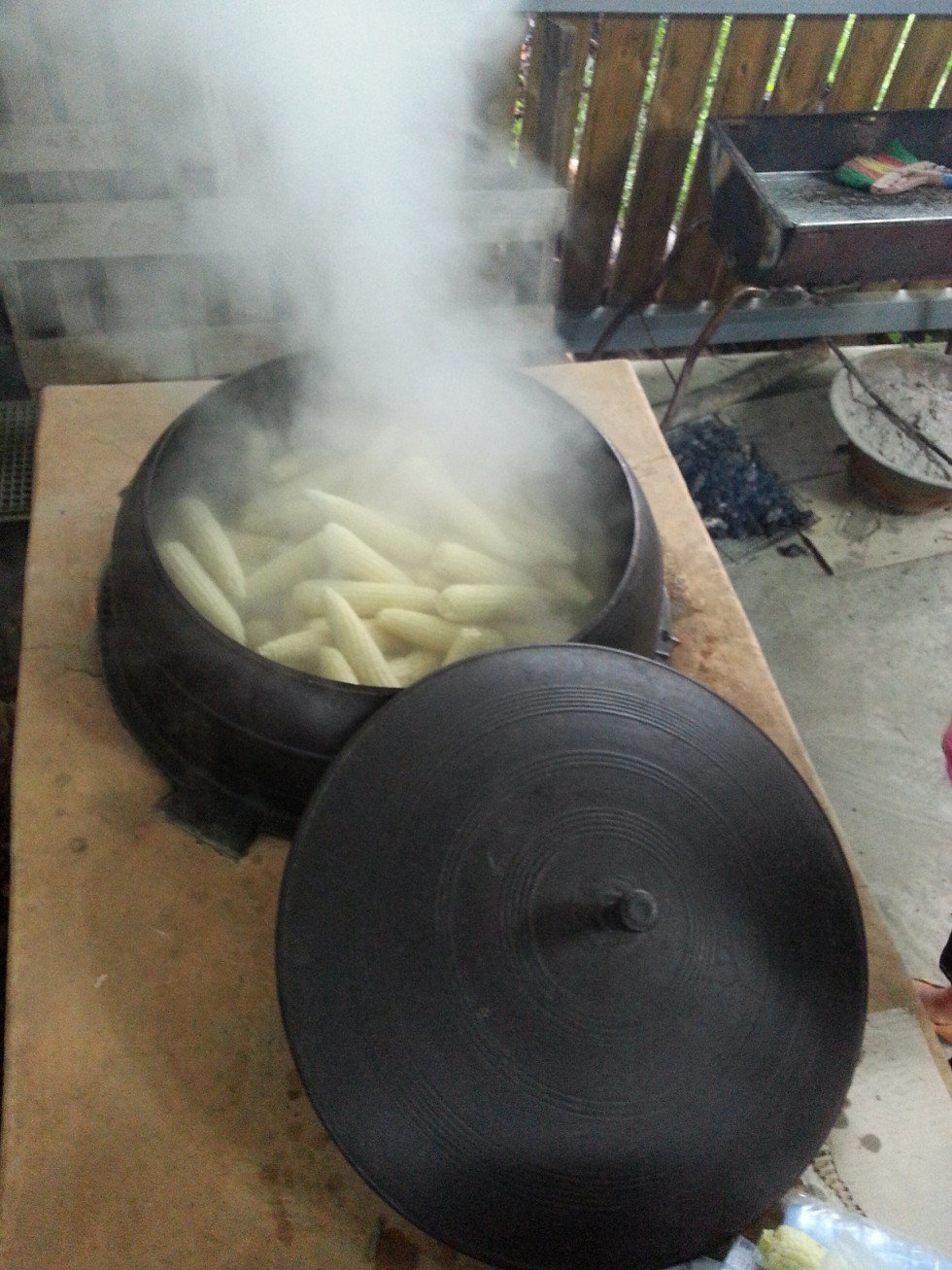 커다란 가마솥에 바로 따다가 쩌먹는 옷수수맛은 구수하고 쫀득쫀득한 맛이 그냥 물에만 삶아도 달달하니